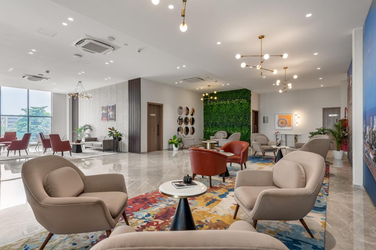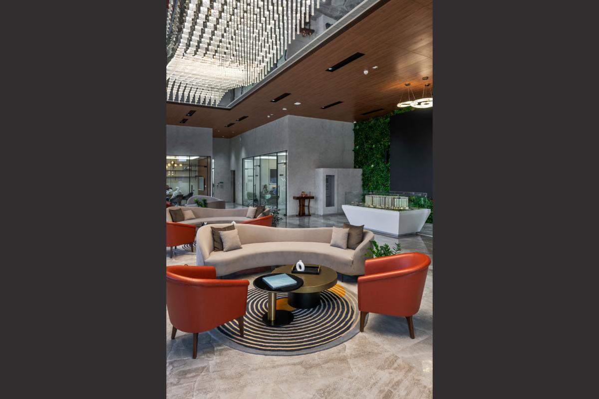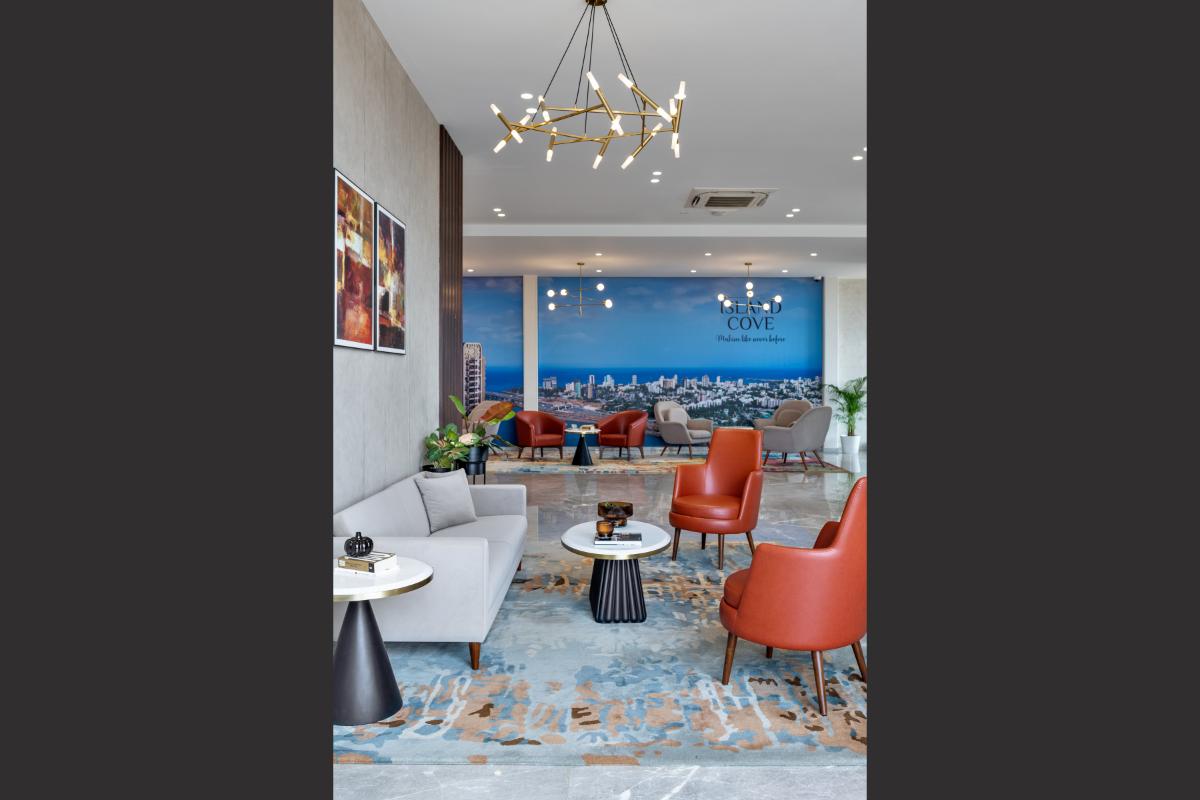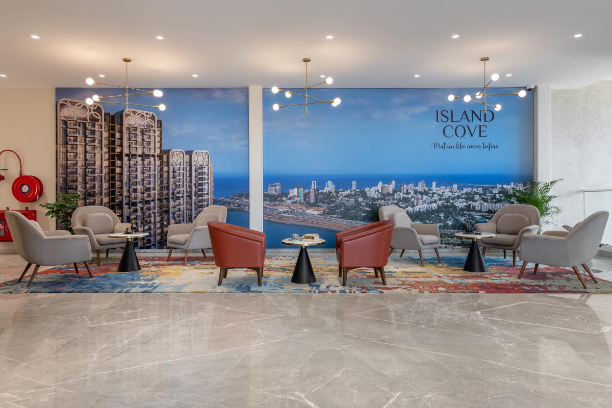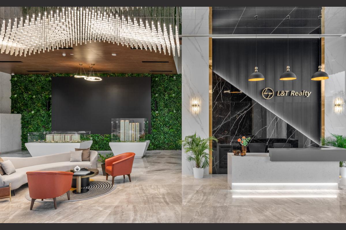 The L & T Realty sales office in Mahim stands as a benchmark of luxury and sophistication, meticulously designed across 10,000 square feet to embody the developer’s prestigious reputation in high-end real estate. Spanning two floors, this opulent facility integrates elegance with functionality to enhance the sales experience for discerning clients. .
