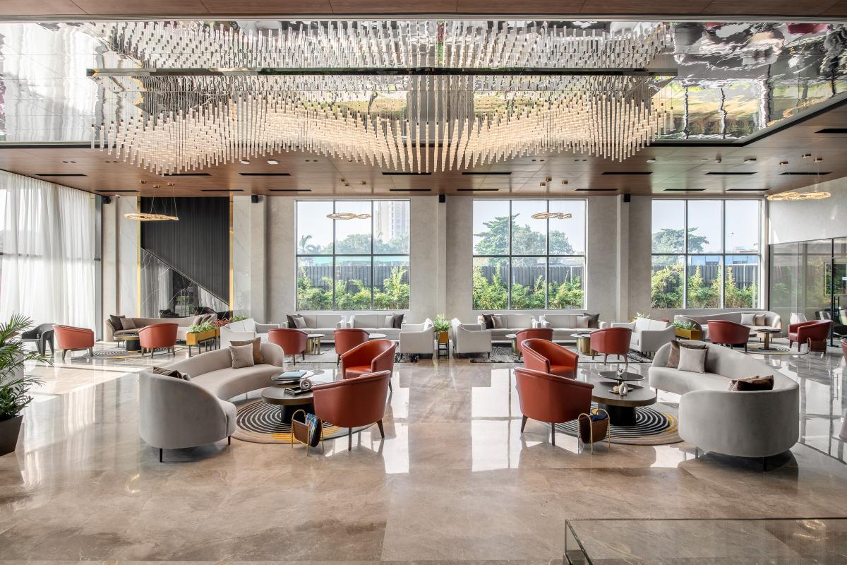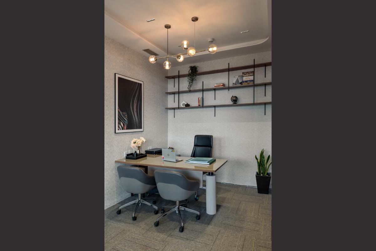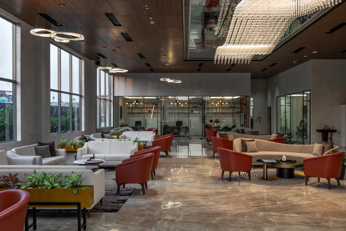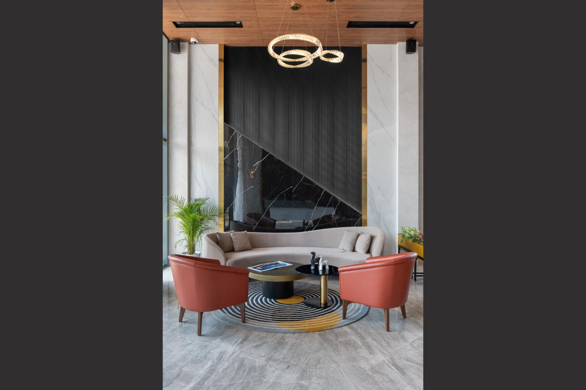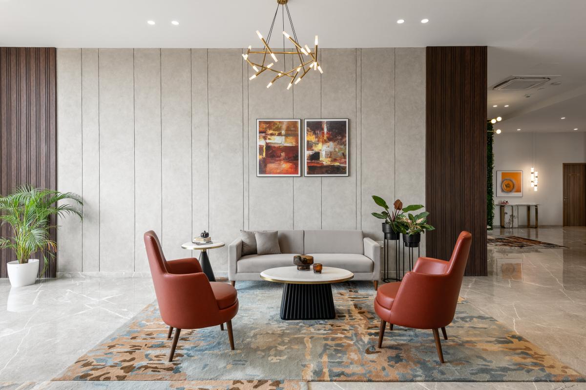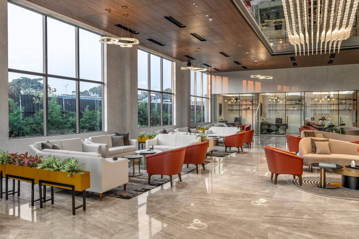 The L & T Realty sales office in Mahim stands as a benchmark of luxury and sophistication, meticulously designed across 10,000 square feet to embody the developer’s prestigious reputation in high-end real estate. Spanning two floors, this opulent facility integrates elegance with functionality to enhance the sales experience for discerning clients. .