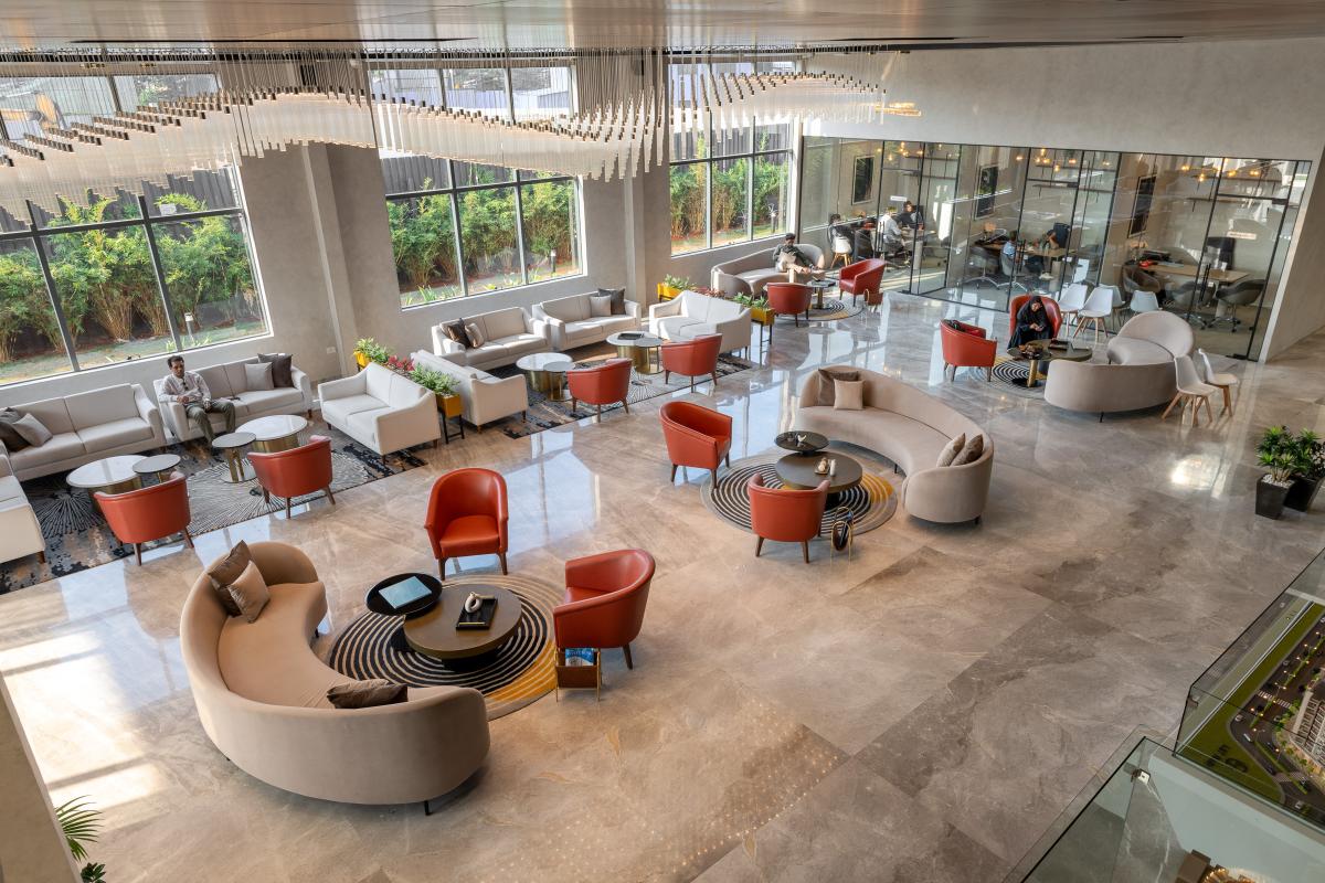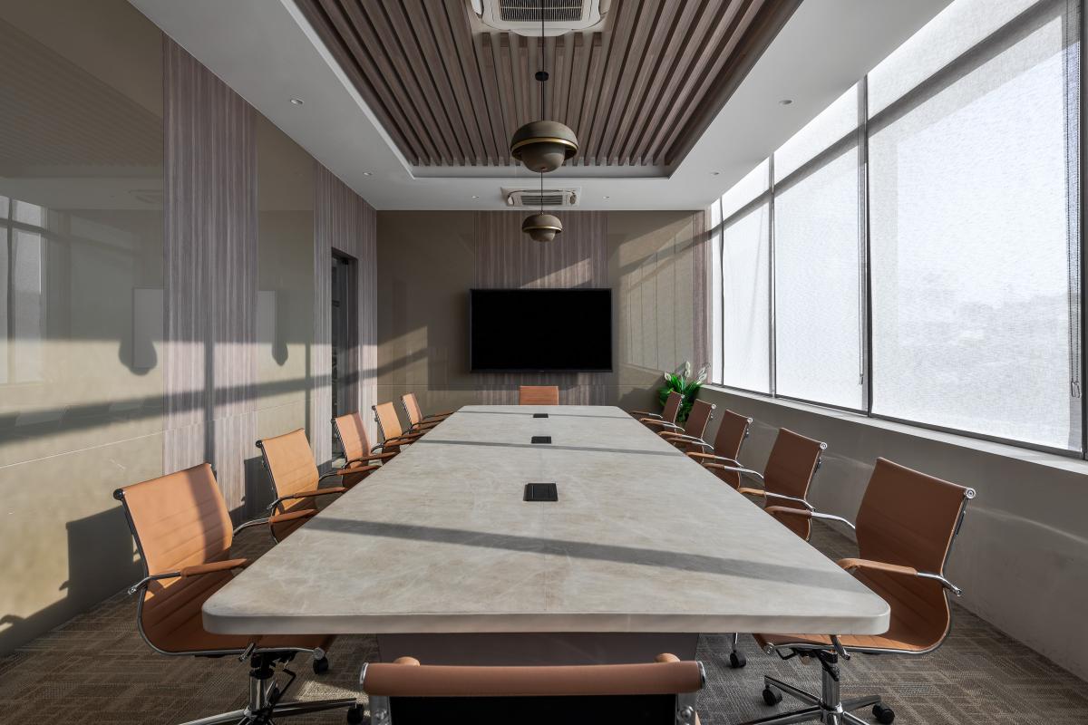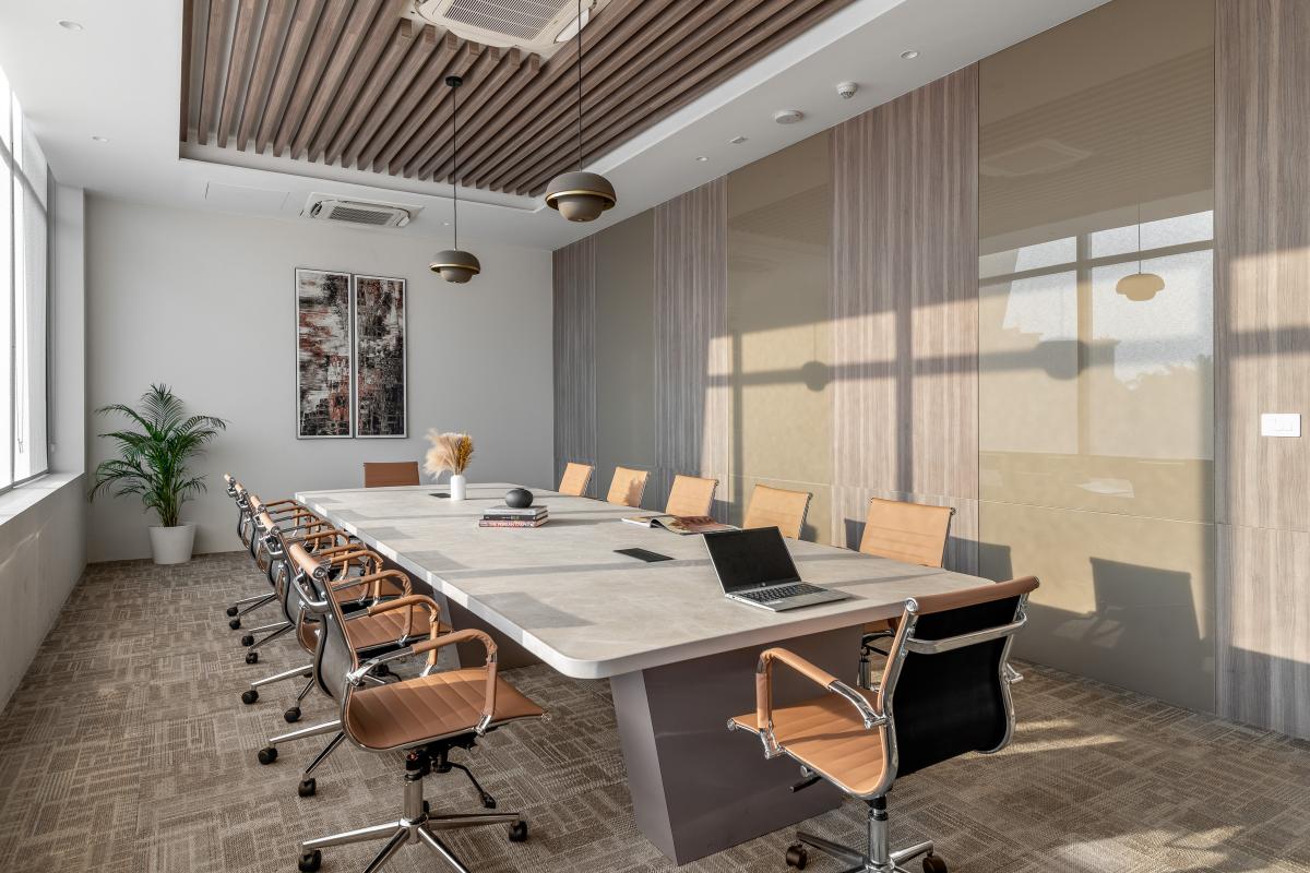 The ground floor greets visitors with a grand reception area that sets a tone of refined elegance. A striking prototype of the upcoming project is prominently displayed, ensuring immediate engagement. The expansive waiting area is crafted for client comfort, providing a relaxed atmosphere before meetings. This level features five meeting rooms designed as private sanctuaries for confidential negotiations. Additionally, a well-appointed cafeteria and a discreet back office are included, catering to the needs of both clients and staff with convenience and privacy.