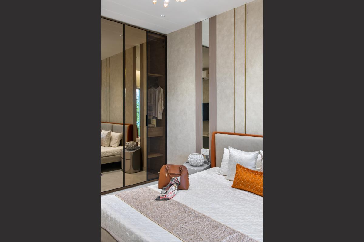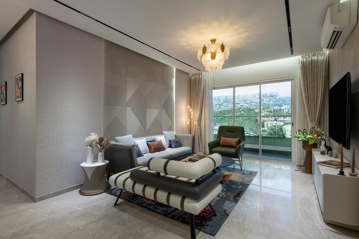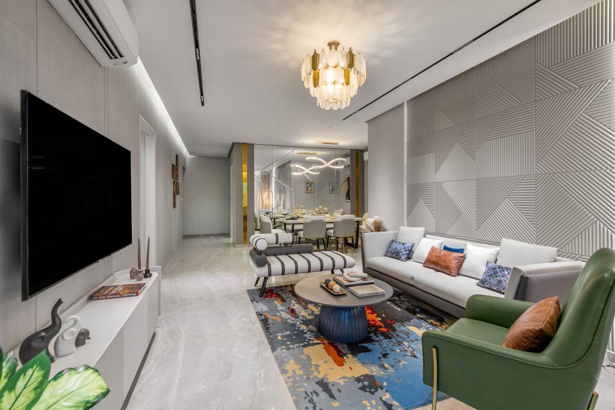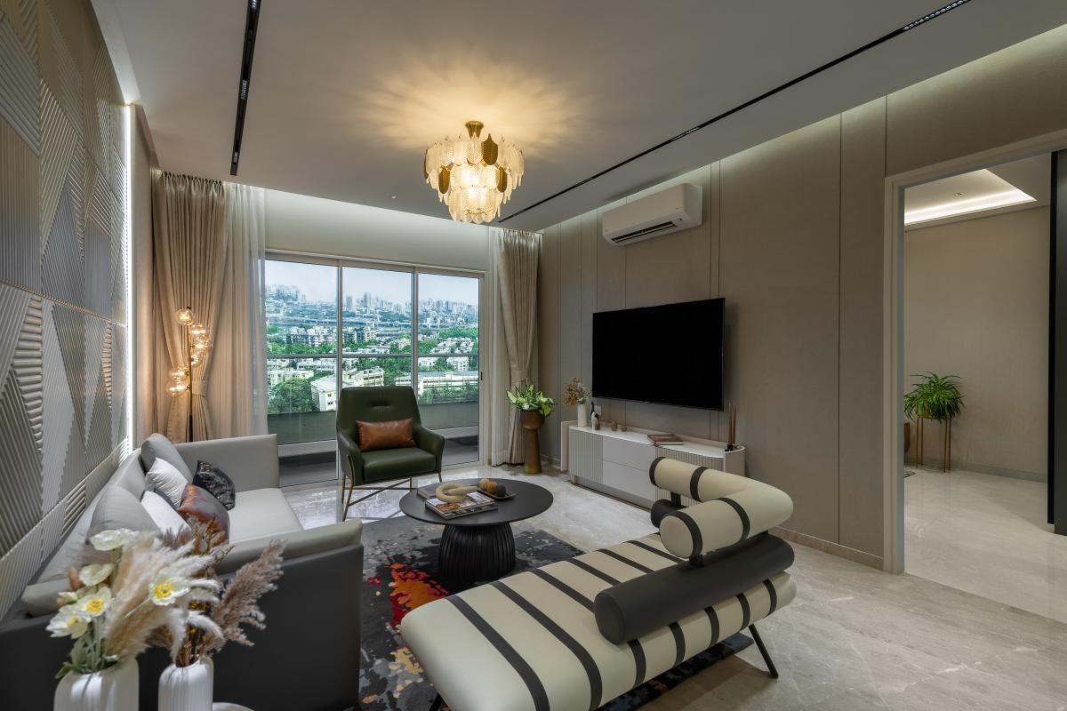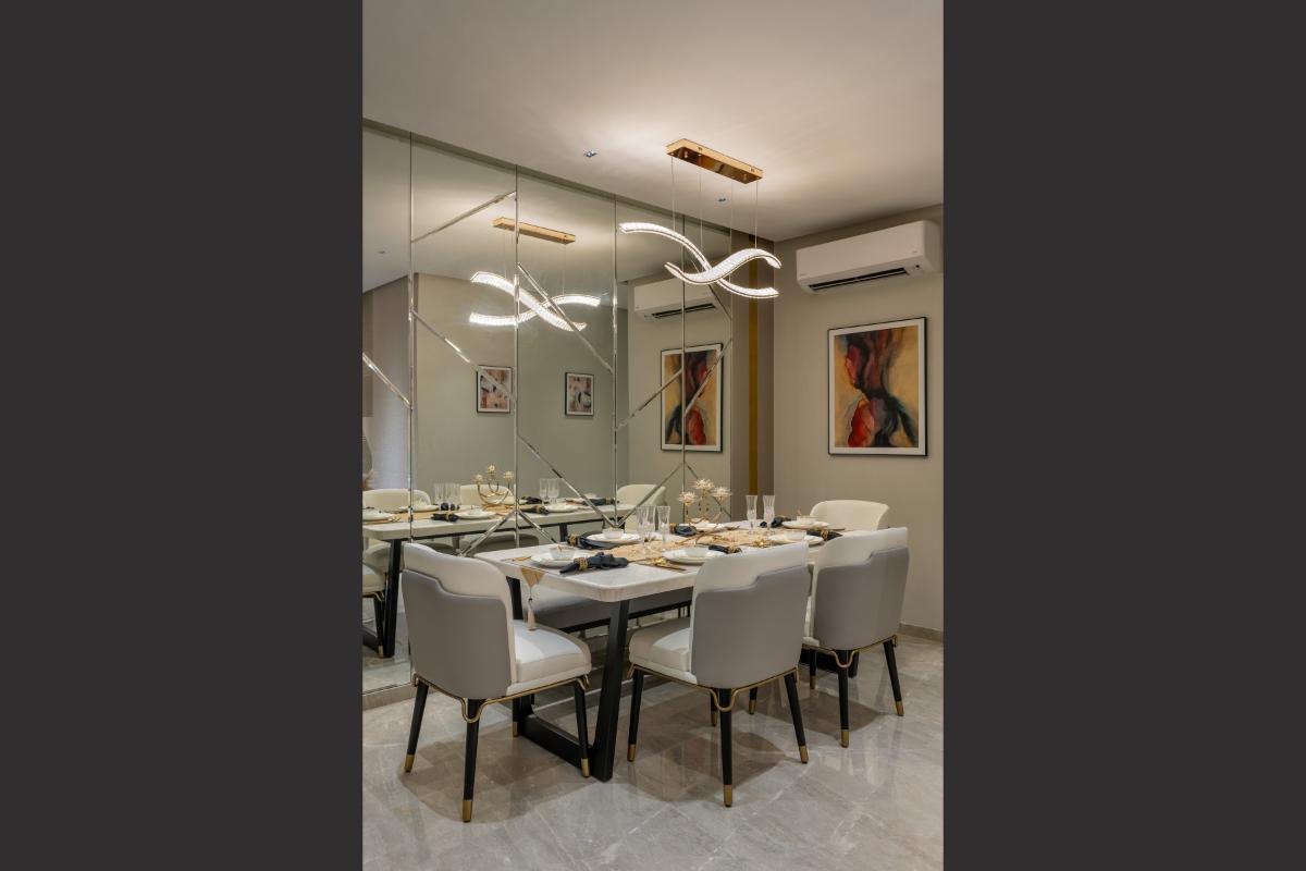The 3-BHK showcase apartment represents the pinnacle of modern luxury, characterized by a blend of style and comfort. The design employs neutral tones and a contemporary aesthetic, appealing to a broad audience. The living and dining areas are highlighted by elegant shades of grey and beige, accented with vibrant furniture and sophisticated mirror paneling, visually opening up the space further.
