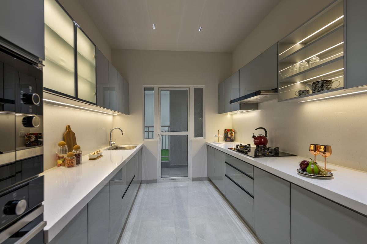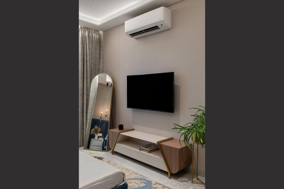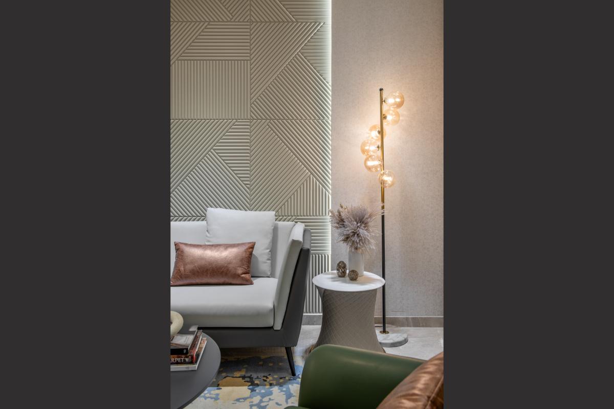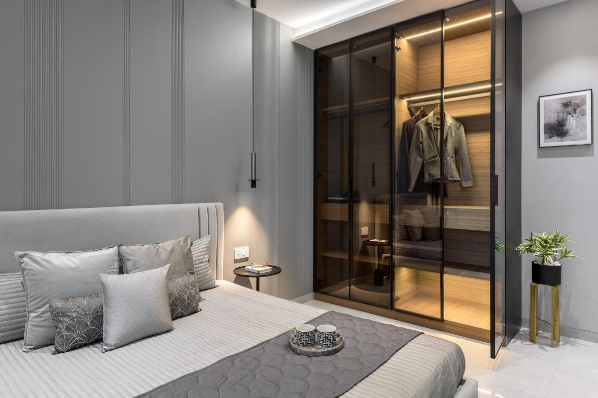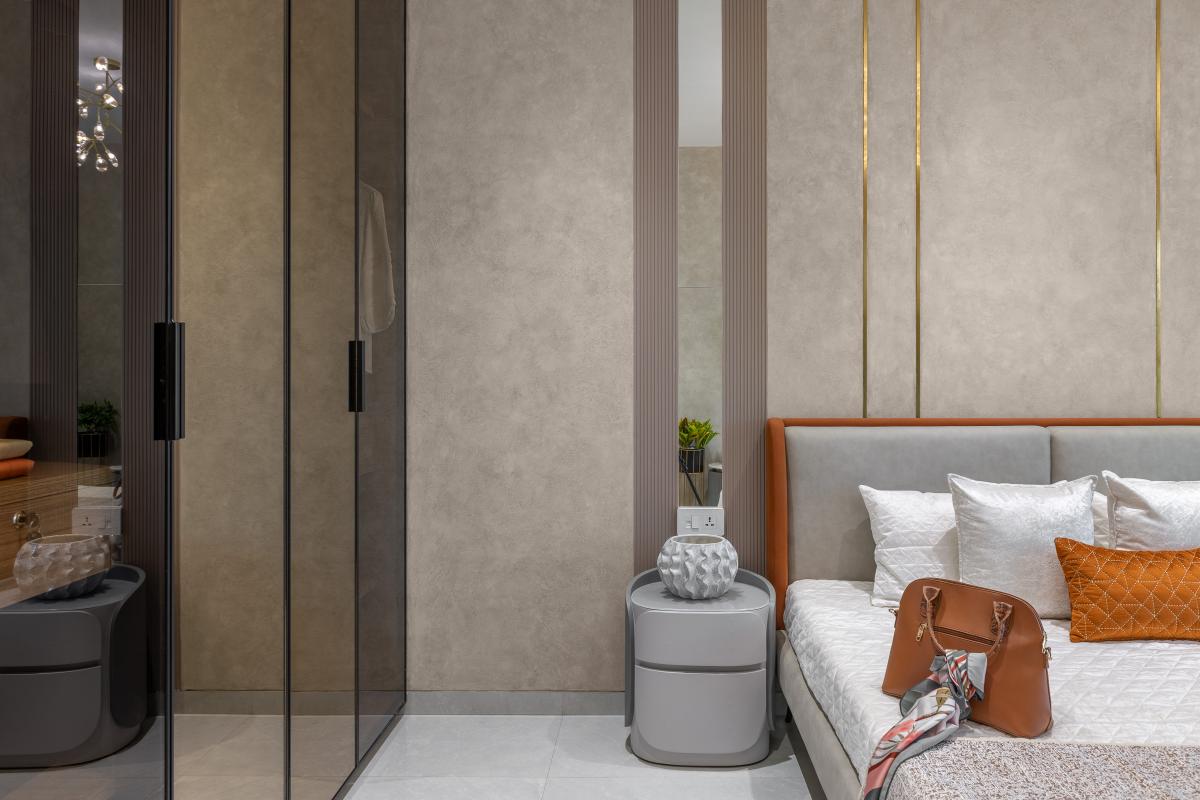 The 3-BHK showcase apartment represents the pinnacle of modern luxury, characterized by a blend of style and comfort. The design employs neutral tones and a contemporary aesthetic, appealing to a broad audience. The living and dining areas are highlighted by elegant shades of grey and beige, accented with vibrant furniture and sophisticated mirror paneling, visually opening up the space further.