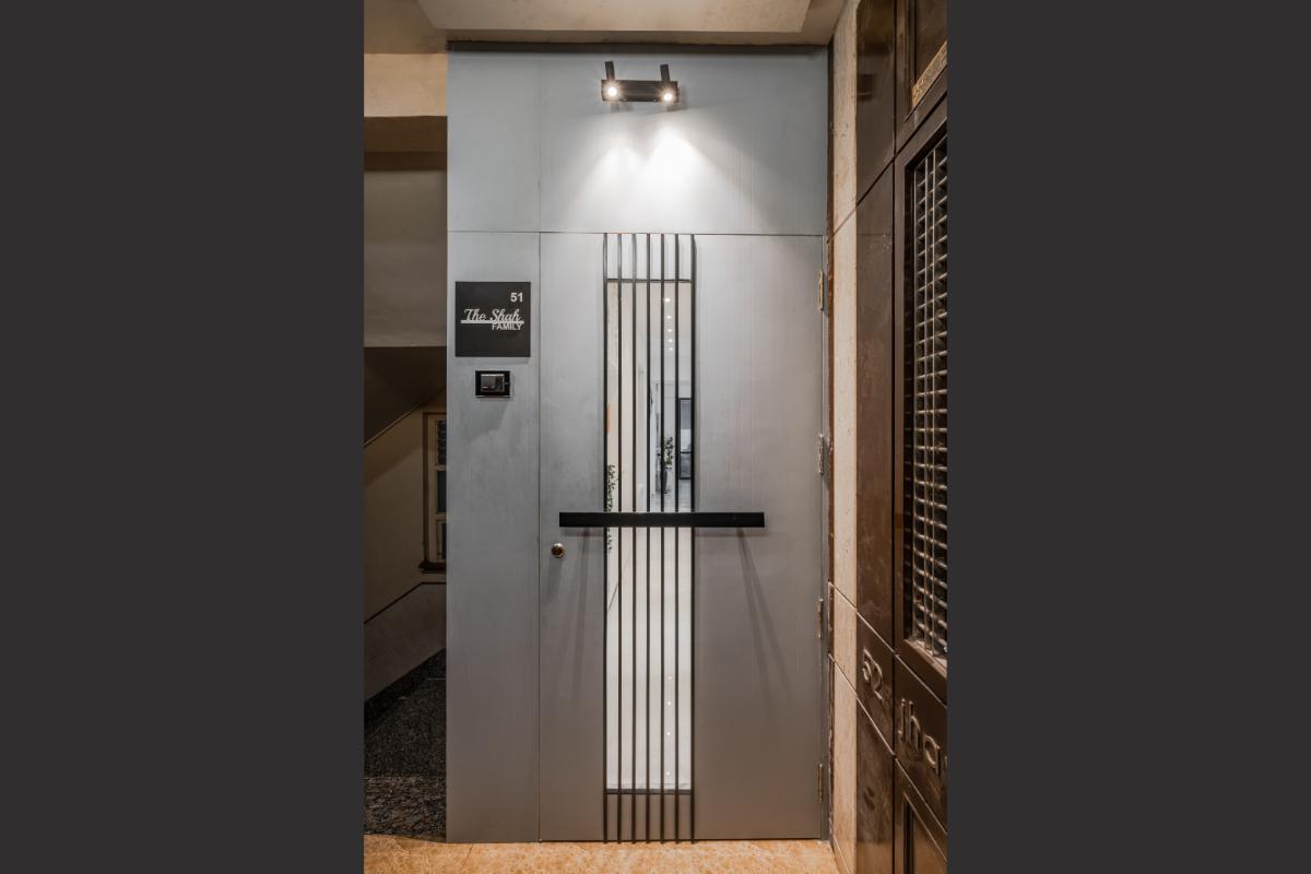 A blue entrance door with black rims creating a stylish and sophisticated look. The blue pastel color adds a touch of warmth and personality, while the black rims provide a bold and defined outline. This combination is visually appealing and making a statement at the main entrance.