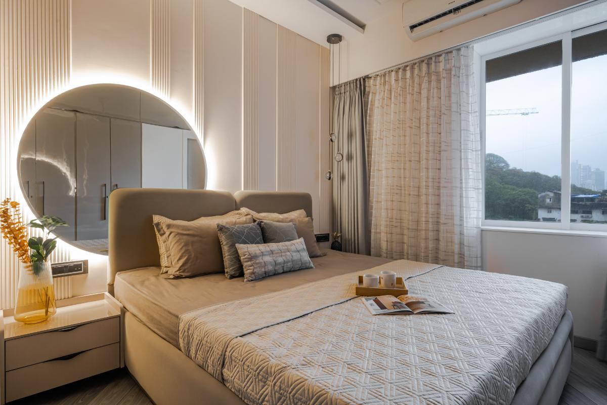 The bed steals the spotlight with an asymmetrical fluted design, its lines dancing in harmony with chic irregularity. Above, a circular mirror takes up, framed in soft backlight that adds a warm, ethereal glow to the space. The wardrobe exudes elegance with shades of pinkish beiges, their gentle hues creating a calming ambiance. Black handles add a touch of modern contrast, a subtle nod to refined design.