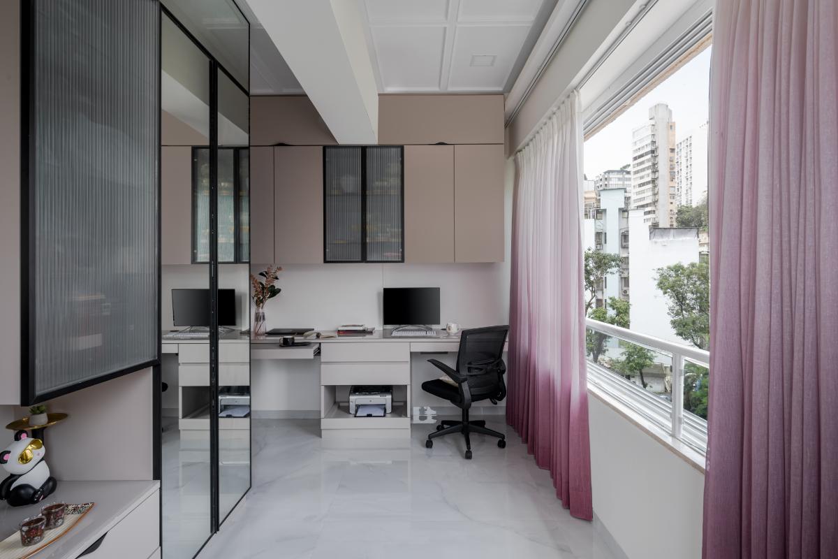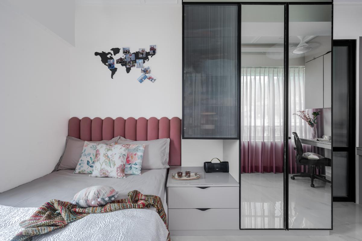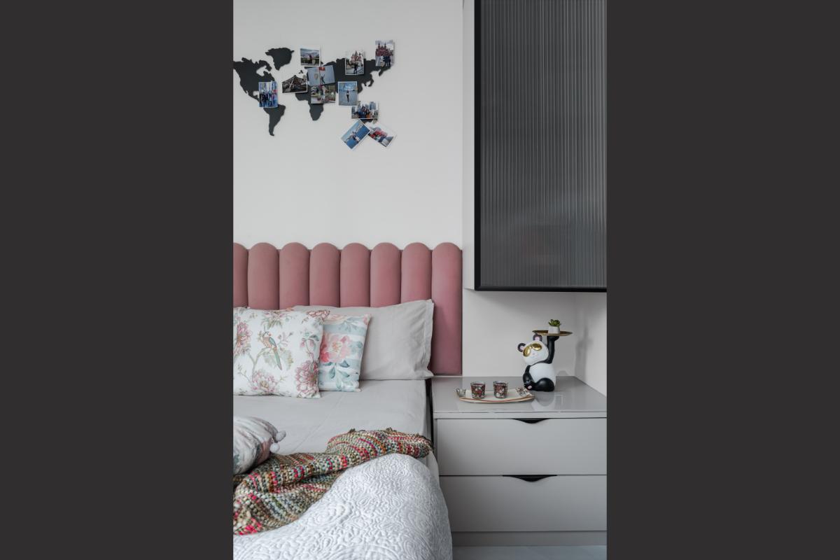 - "Daughters Bedroom" – Step into the realm of versatility and charm – where the bedroom is not just a bedroom space but a multifunctional area. A dreamy retreat with a bed adorned by a chic pink headboard, cocooning you in warmth and style. Reflect your aspirations in the mirrored finish wardrobe, while a study table beckons for collaborative creativity with space for two. Soft shades of pink and whites envelop the room, creating a serene ambiance. A touch of wanderlust hangs above the headboard – a world map, a reminder that dreams have no boundaries. Slide open the door to connect with the vibrant energy of the living room. opening up the space to light and ventilation was important, and this largely dictated the white-washed palette of the space.