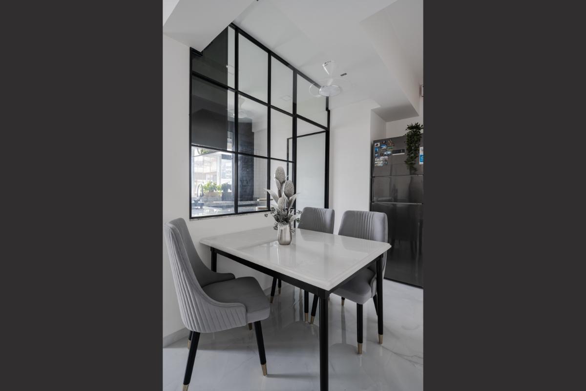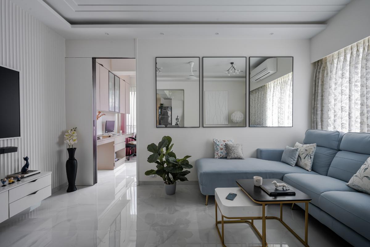 Picturing a harmonious dance of black and white hues, creating an elegant symphony of sophistication. Amidst this monochromatic canvas, a pastel blue sofa takes center stage, adding a pop of personality and energy. It's not just a space; it's a celebration of contrast, where every detail tells a story of modern elegance. Welcome to the heart of home design excellence.