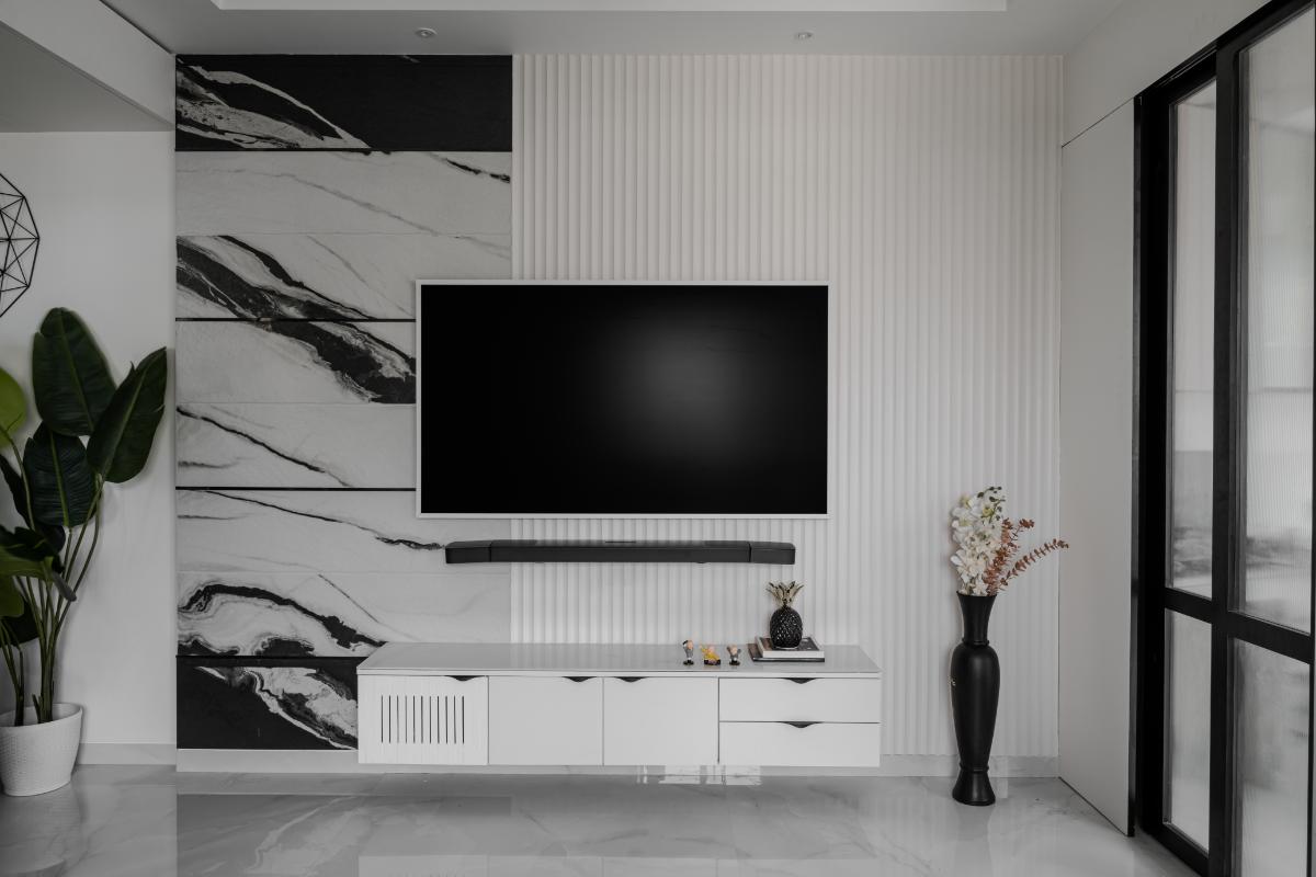 The epitome of monochromatic elegance in our TV wall design. A captivating fusion of black and white, where tiles and fluted panels intertwine. TV wall design – a seamless fusion of black and white tiles paired with pristine white fluted panels.